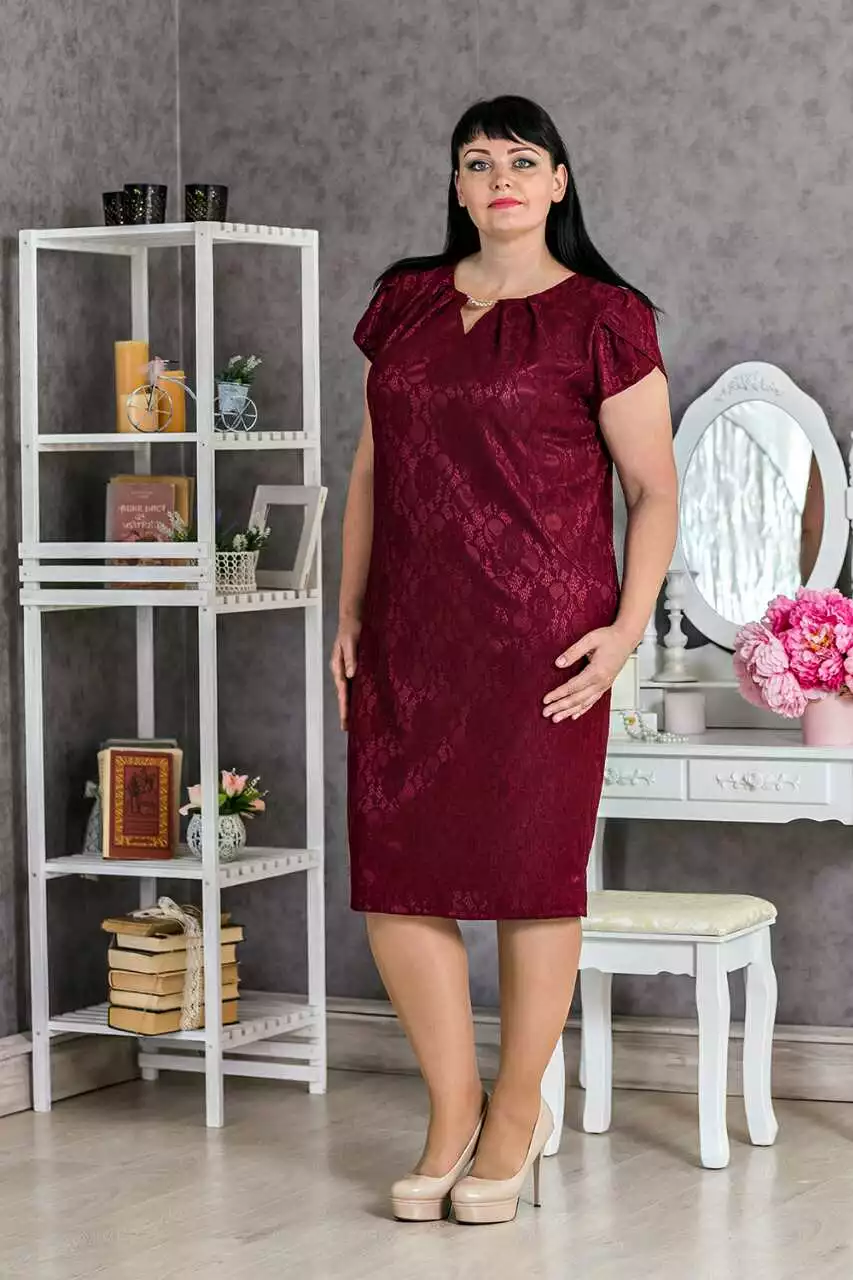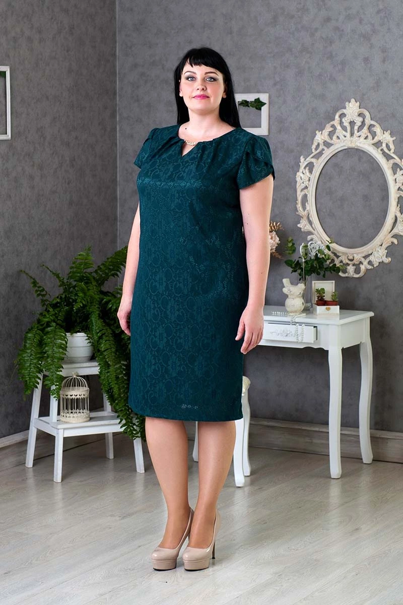 Платье праздничного назначения, выполнено из изысканного материала. Простота кроя и сдержанность силуэтных линий не утяжеляют внешний вид. Отделка - потайной замок-«молния» и шлица на спинке. Впереди - рельефы, складки по горловине, золотистое украшение. Длина изделия (в 56р) - 107см, рукава - 15 см. Материал - гипюр на атласе